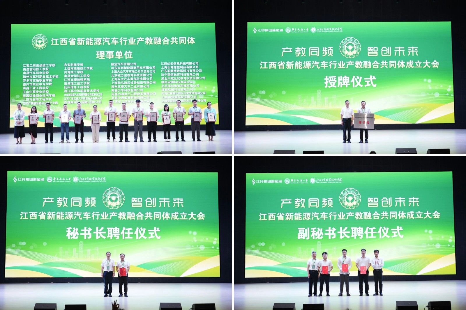 会议审议通过了《江西省新能源汽车行业产教融合共同体章程》,选举、通过第一届理事长单位、常务副理事长单位、副理事长单位、理事单位。在与会人员的共同见证下,江西省新能源汽车行业产教融合共同体正式成立。随后为共同体揭牌,并为共同体理事单位授牌及颁发聘书。