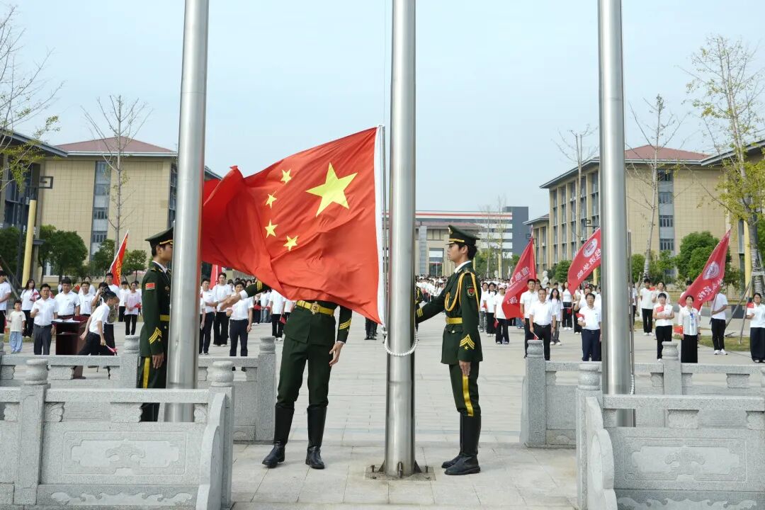学校国旗护卫队迈着整齐、铿锵的步伐,护卫国旗入场。伴随着雄壮激昂的《义勇军进行曲》,鲜艳的五星红旗冉冉升起,全体师生肃立行注目礼,爱国情怀与使命担当在每一位师生心中激荡。