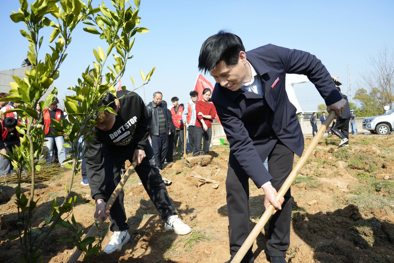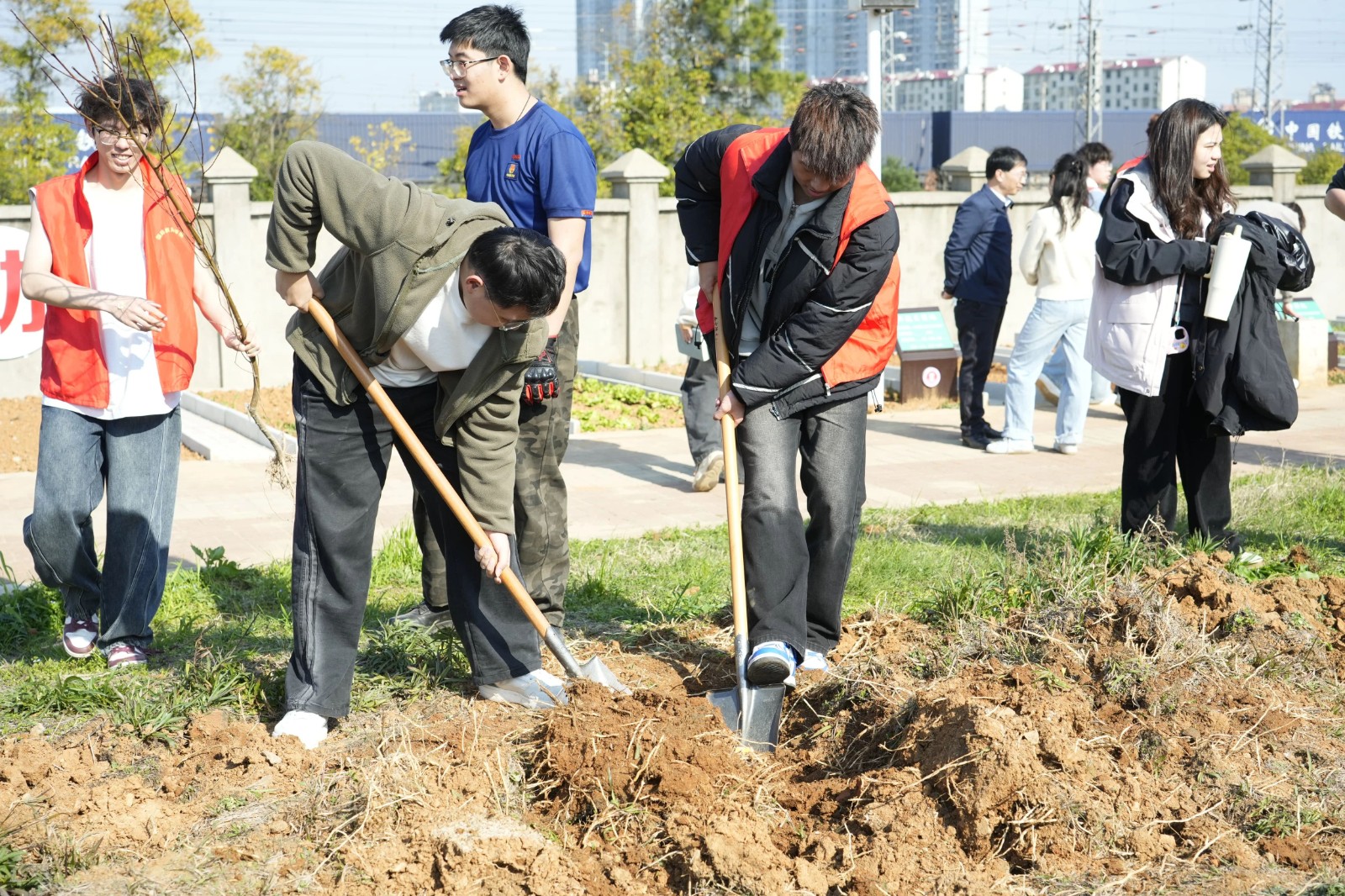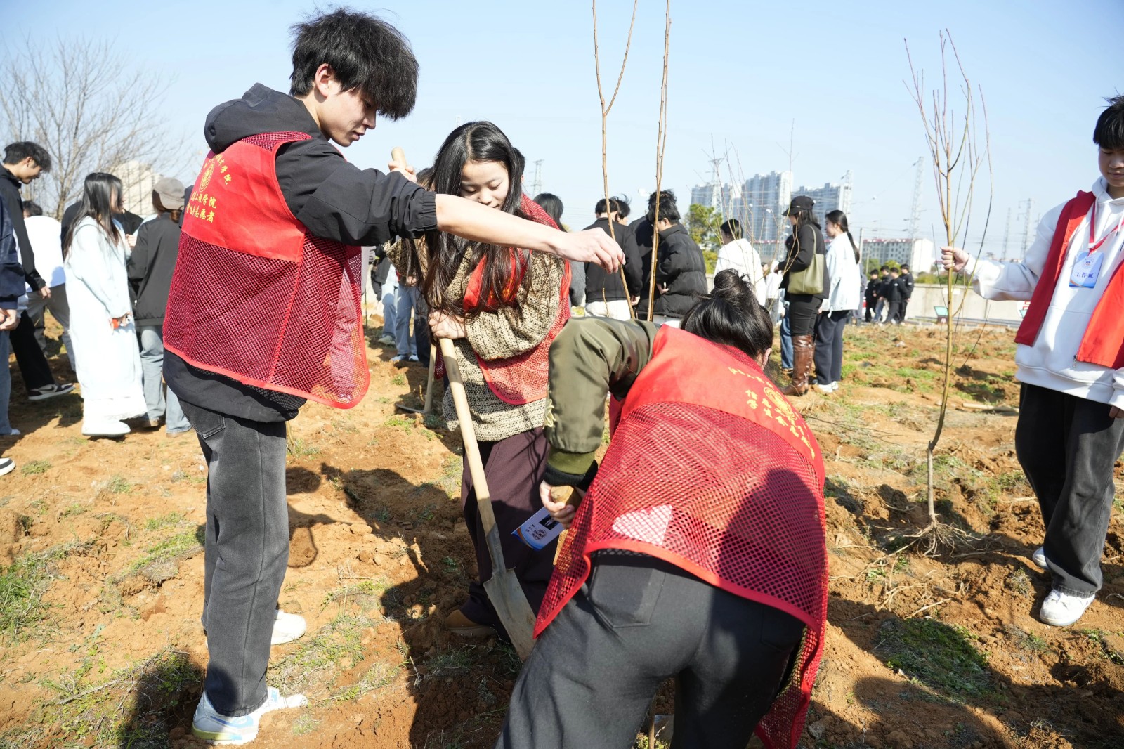 植树现场,大家挥锹铲土、扶正树苗、培土围堰、提水浇灌,每一个步骤都认真细致,严格遵循“三埋两踩一提苗”的技术规范,确保树苗栽植质量。身着“红马甲”的学生志愿者在现场全程指导、协助,保障活动顺利进行。