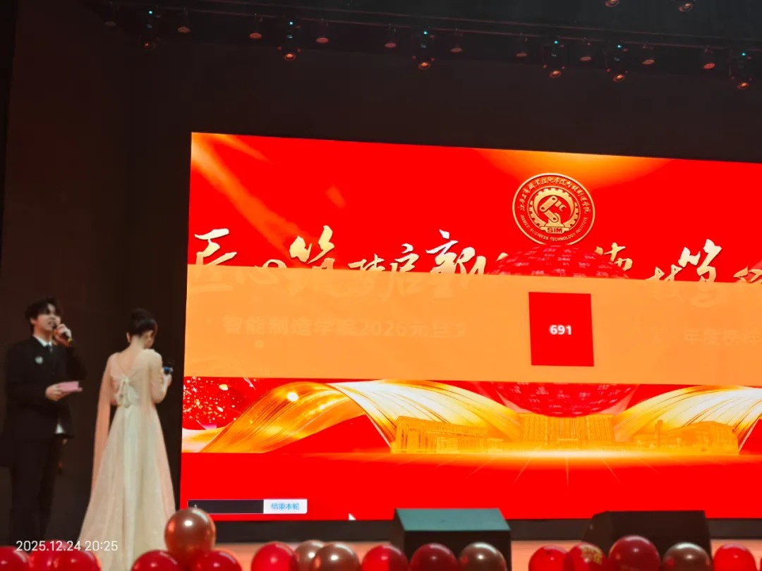 昨夜星光灿烂,今宵掌声不息。12月24日晚,智能制造学院“跨越新元,奔赴新愿”2026元旦文艺晚会暨青春智能制造年度榜样人物颁奖典礼在学校大礼堂隆重举行。师生欢聚一堂,共迎新年,见证荣耀,放飞梦想。
