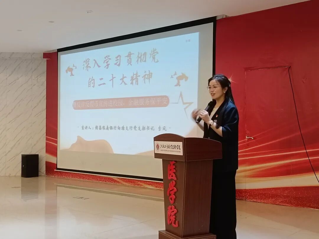为了深入学习贯彻党的二十大精神,提高学生反诈反假币意识,赣昌农商银行向塘支行党支部书记李凤于4月16日下午在医学院学术报告厅开展反诈反假币宣传讲座,医学院党支部代表,学生代表参加本次讲座。