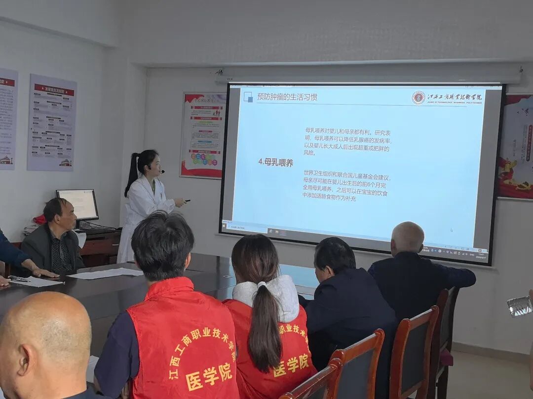 随着现代生活节奏的加快,肿瘤疾病逐渐成为影响居民健康的重要疾病问题。为了提高民众对肿瘤防治的认识,增强居民的自我保健意识,我院于4月17日的下午在向塘镇民西社区特举办此次肿瘤防治宣讲活动。此次讲座的宣讲人是我医学院专职教师肖芳,辅导员赵睿康老师、徐星星老师、“红色悬壶”及“红色天使”志愿者代表参与本次活动。