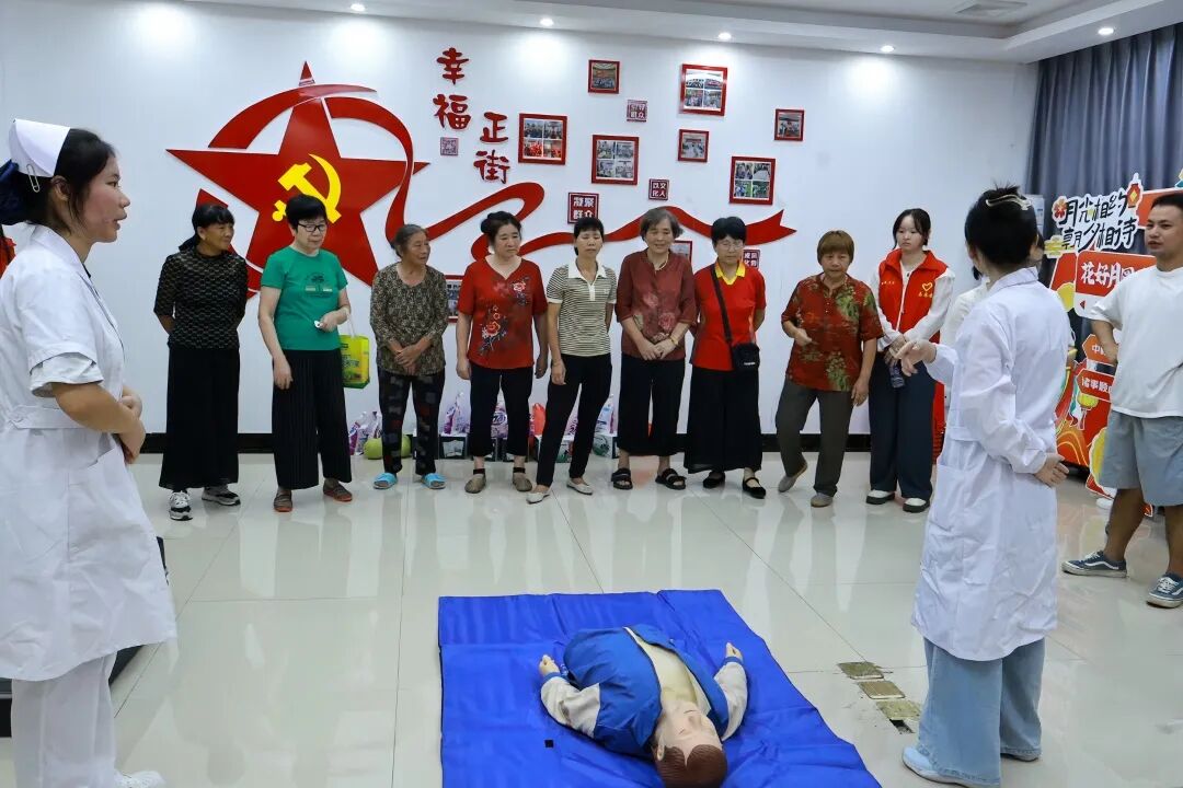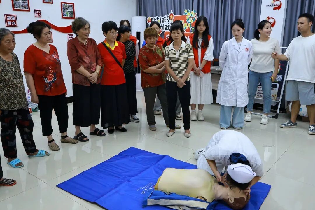 讲座结束后,医学生志愿者们带领居民们进行了实操演练。他们首先示范了心肺复苏的全过程,包括判断意识、启动急救、评估体征、按压、通气及AED使用等关键步骤。随后,居民们在志愿者的指导下亲自操作,体验了心肺复苏的整个过程。