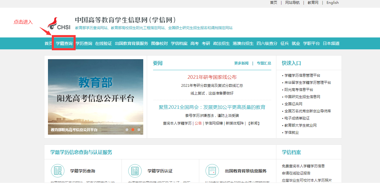 登录网页https://www.chsi.com.cn/,进入网页点击“学籍查询”,如果之前有注册过,点击“登录学信档案”登录,如果没有注册过,点击“注册学信网账号” 注册学信网账号。