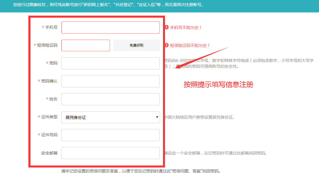 按照提示填写信息注册