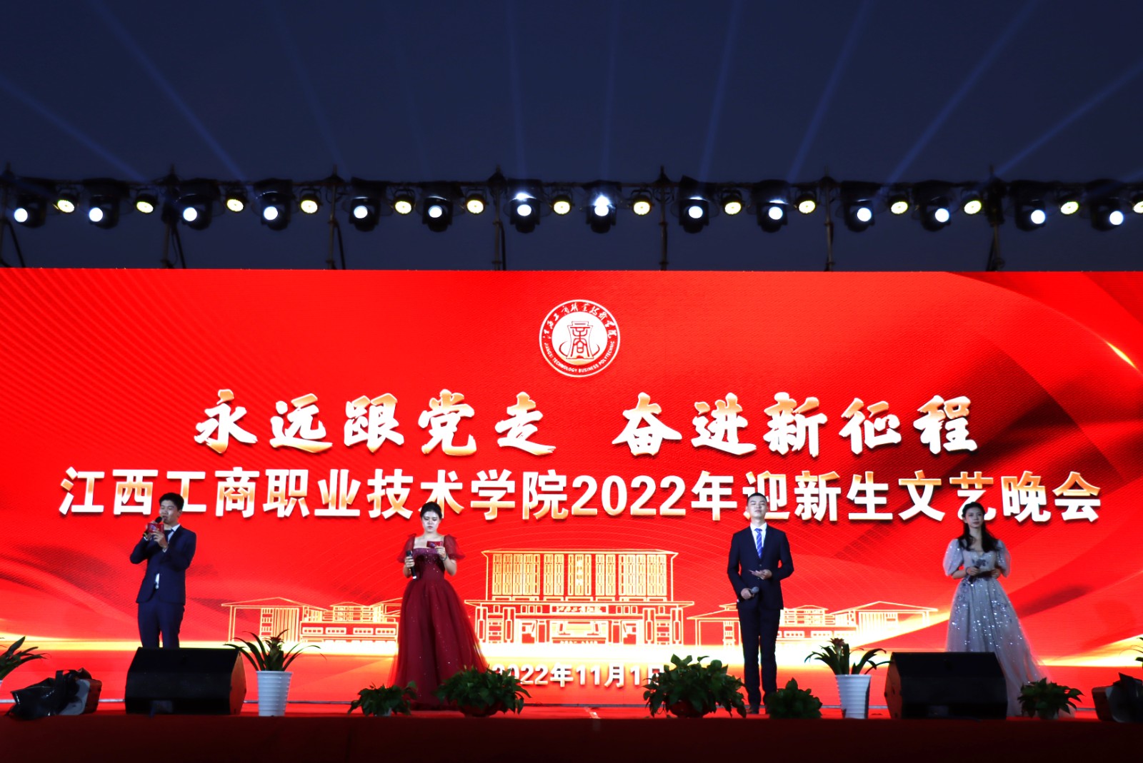 11月1日晚,江西工商职业技术学院隆重举行“永远跟党走 奋进新征程”2022年迎新生文艺晚会。学校党委书记赵顶兴,校长刘明初,常务副校长李盛艳,党委副书记马江华,副校长辛绍南、胡志鹏、王木生,校长助理胡鹏飞出席晚会。晚会节目均由我校老师指导、编排,师生代表出演。此次晚会采用现场与直播相结合的方式,为现场师生及线上观众带来一场视觉盛宴。