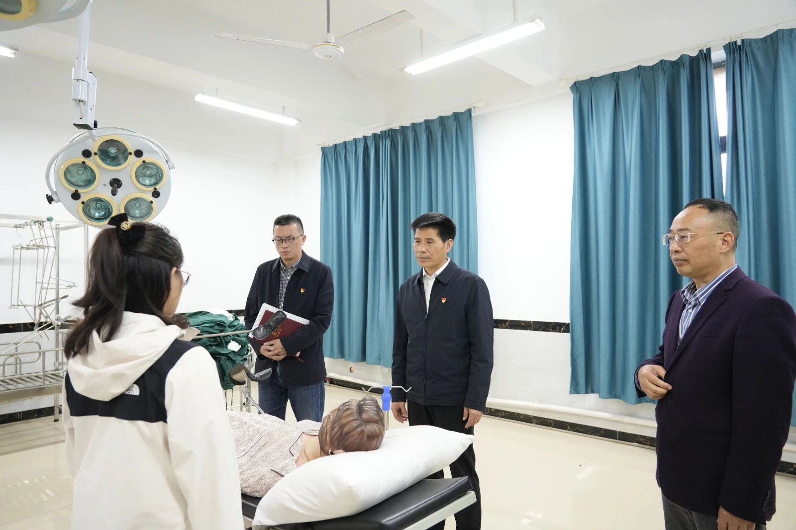 应露晨深入学院理论教学教室、护理技能实训中心、临床模拟病房、基础医学实训室、教师工作室、党团活动室等场所,实地查看理论课堂、实践教学、设施设备等运行情况,认真听取学院在学习教育、人才培养、医教协同、产教融合等方面工作汇报以及学院当前存在问题和困难。