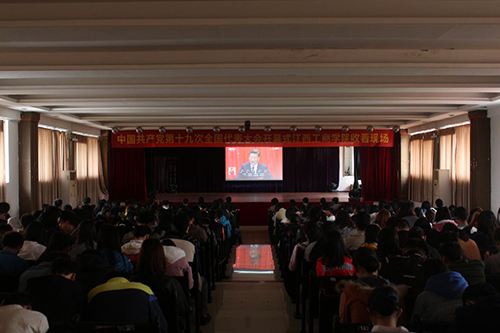 举世瞩目的中国共产党第十九次全国代表大会于10月18日9:00在北京人民大会堂隆重开幕,习近平同志代表十八届中央委员会向大会作报告。中国共产党第十九次全国代表大会,是在全面建成小康社会决胜阶段、中国特色社会主义进入新时代的关键时期召开的一次十分重要的大会。根据上级文件精神和院党委的部署,18日上午8:30开始,我院组织全体党员干部和师生员工在主会场及5个分会场和多个教室收看党的十九大开幕式。学院党委书记周瑾,院长刘明初,副书记、副院长傅江海,副院长旷强军、胡国辉,机关部门主要负责人在主会场报告厅集体收看十九大开幕式。