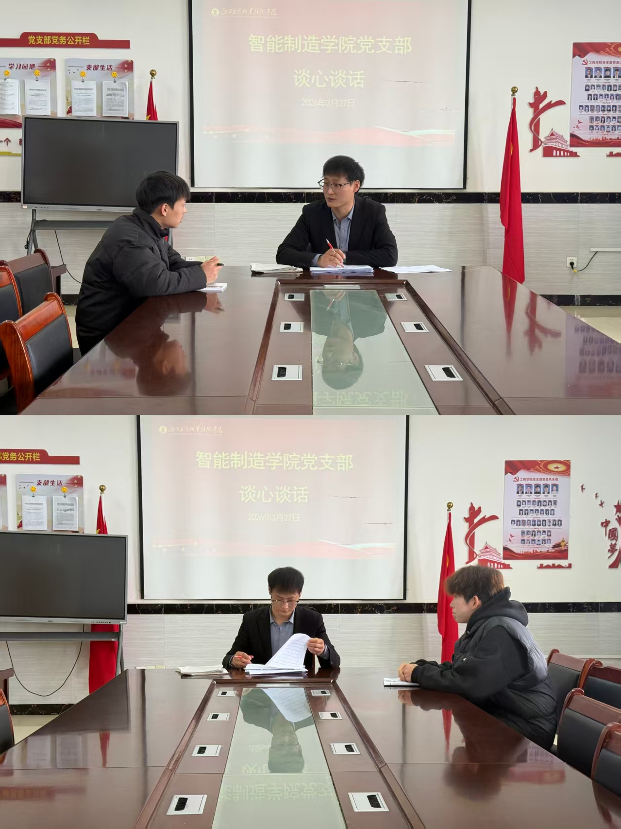 为严格党员发展程序,加强对入党积极分子的教育培养,3月27日,智能制造学院党支部组织开展了入党积极分子谈心谈话活动。本次活动由支部组织员任泰鸣主持。