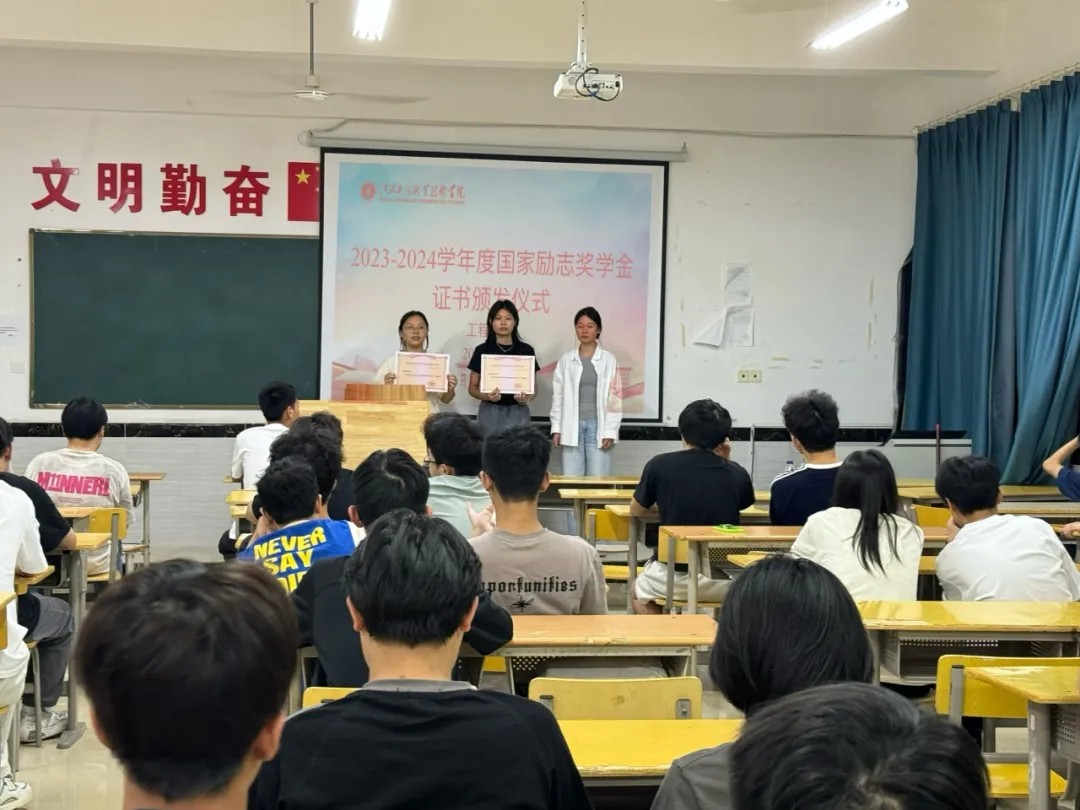 各在校班级也分别举行了国家奖学金证书的发放仪式。班级的学生代表分享了自己获得奖学金的感受,并号召同学们相互学习,共同进步
