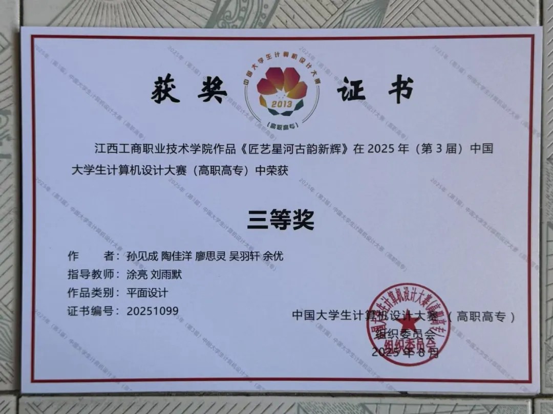 2025 年 8 月 3 日,我院学子在带队教师涂亮的带领下,奔赴上海出版印刷高等专科学校奉贤校区,参加 2025 年(第 3 届)中国大学生计算机设计大赛(高职高专)数媒静态设计竞赛。本次赛事汇聚了全国 19 个省市 173 所高职院校的 435 件作品,竞争异常激烈。经过四天的激烈角逐,我院两支参赛队伍凭借扎实的专业功底和出色的创意表现,最终荣获国赛三等奖 2 项,为学校赢得了荣誉。